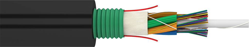 Typically, this cable consists of a stranded core with a central strength member (FRP) and dry loose tubes with optical fibers. The stranded core is fixed by water-swellable yarns. A water-swellable tape is laid over loose tubes. An armor of corrugated steel tape is laid over the water-swellable tape.